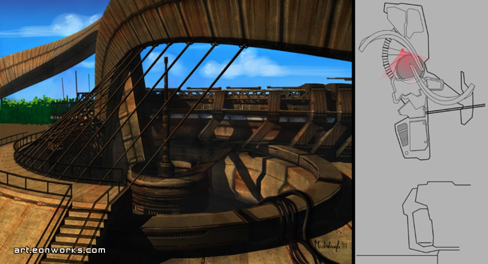 I love the arc going deep into the chasm. What I find most intriguing would be the cables attaching the "twist" to the ground. They add a sense of stability to the picture. However, the cords leading into the chasm (the hoses) seem to give it a sense of instability again... as if it is under maintanence, or not very safe.
