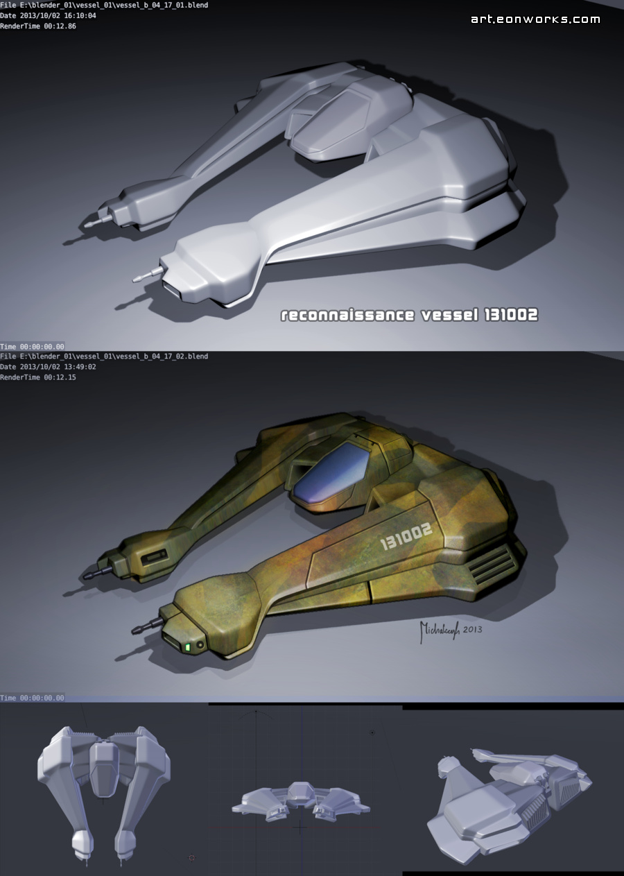 I have been learning Blender (a free 3D program) on and off for some months now. I can now do enough modeling to do concepts, but I still need to experiment a lot with materials and rendering. So far I have not had any major problems with Blender and I enjoy using it, and it looks like it will satisfy my needs. Nevertheless, it does take some time to get used to and learn how to do things the blender way. This reconnaissance vessel is my first concept done in Blender and it was a good way to learn the type of 3D modeling functionality that I use a lot. Initially I wanted to do all texturing in Blender, but unfortunately there is no way to draw a straight line on the surface of a model. Hopefully such functionality will be added soon, which is essential for a lot of texture work. Anyway, I still have a lot of learning to do and my next project is going to be either another Sci-Fi vessel or a space cannon.