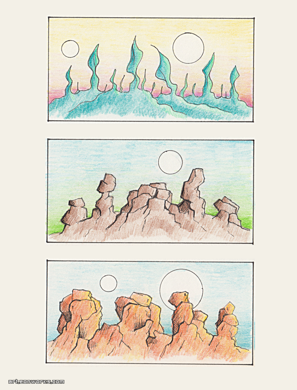 13 February 2016 ■ I have been doing more space art sketching lately. I use graphite, colored pencils and black ink. At first I used Polychromos colored pencils by Faber Castell and although they are nice to draw with they are expensive for doing sketches so I started looking for a cheaper alternative. First I tried the Norris Club 144 colored pencils by Staedtler. They have very good covering power on different papers, but unfortunately they are not pigment rich so the colors are on the weak side. Furthermore, only 12 of the total 36 colors are available as open stock. They are very inexpensive though. Later I tried the Polycolor colored pencils by Koh-I-Noor. They seem to have just as much pigment as the expensive Polychromos and yet cost about 70% less. They don't break, and all colors are available as open stock. They are smooth to draw with and they don't smudge. So I draw with the Polycolor pencils at the moment and enjoy using them. I have done so many sketches during the past year or so that I decided to put some of them online in a new space sketching gallery. Hopefully I'll have the time to further explore at least some of these sketching ideas as digital artwork.